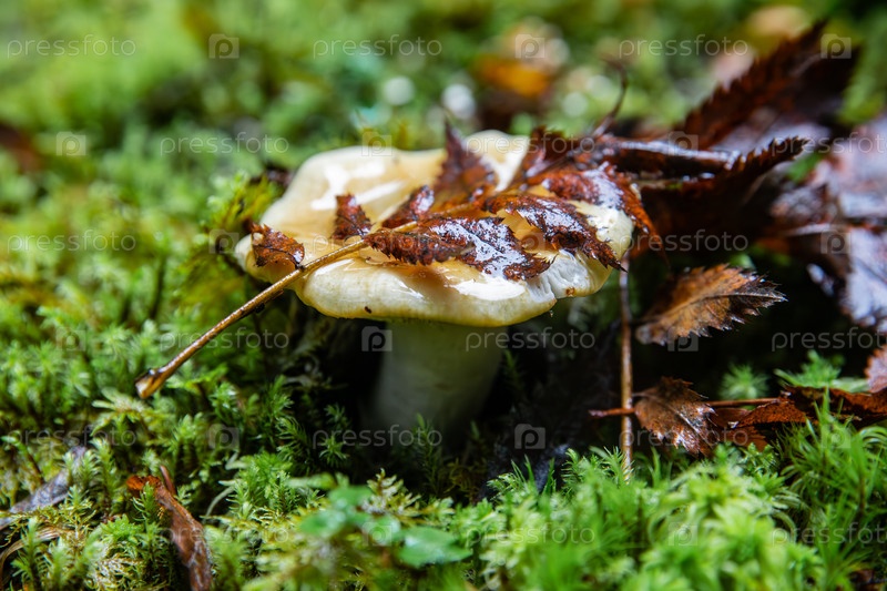 Молочный гриб под листьями в мхе