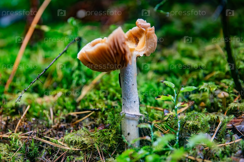 Грибная шапка с кольцом и изогнутой шляпой на мохе