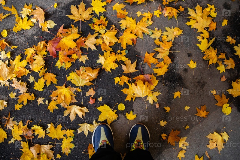 Осенние листья на асфальте и ноги в кроссовках
