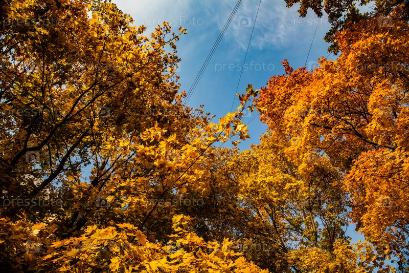 Осенние деревья с желто-оранжевыми листьями на фоне голубого неба