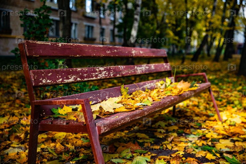 Парк осенью: скамейка, покрытая упавшими листьями