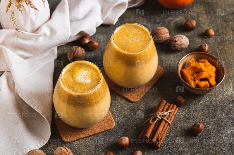 Осенний латте с тыквенным пюре, орехами и корицей в стаканах на столе