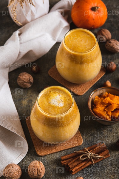 Осенний латте с тыквенным пюре, орехами и корицей в бокалах на столе вертикальный вид