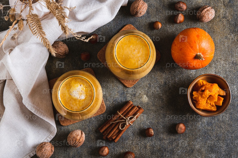 Отогревание тыквенного латте в стаканах до верхней части стола