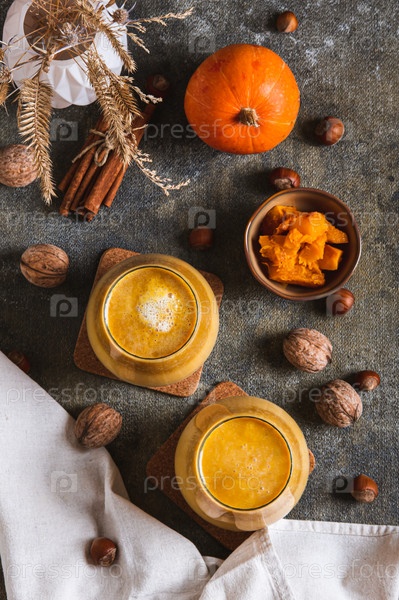Осенний латте с тыквенным пюре, орехами и корицей в стаканах на столе и вертикальный вид
