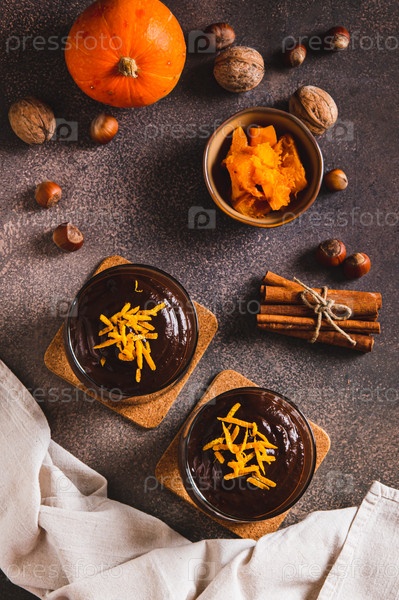 Осенний шоколадный тыквенный десерт с бокалами на столешнице и вертикальным видом