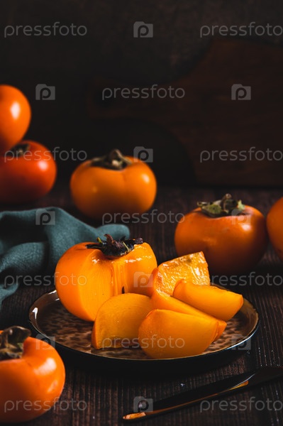 Свежий спелый нарезанный персимон на тарелке на столе вертикальный вид