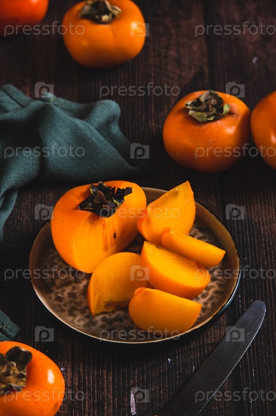 Куски и половины плодов персимона на тарелке и на столе вертикальный вид