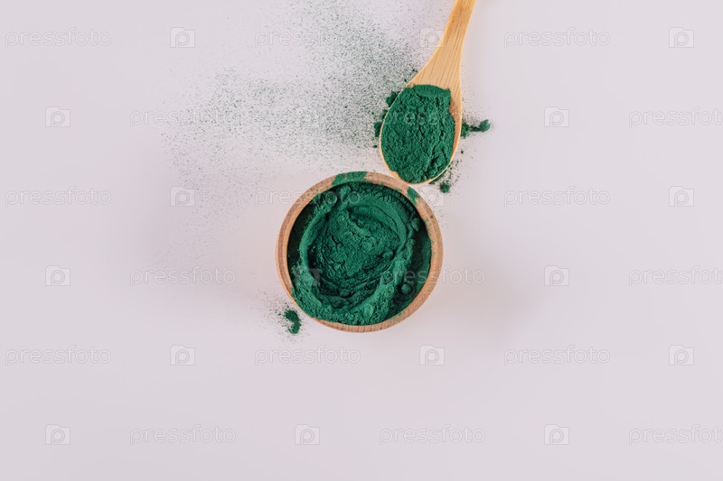 Деревянная чаша и ложка, наполненные натуральным порошком спирулины. Синий, зеленый суперпродукт. Детокс. Органическая добавка для похудения. Вид сверху. Белый фон