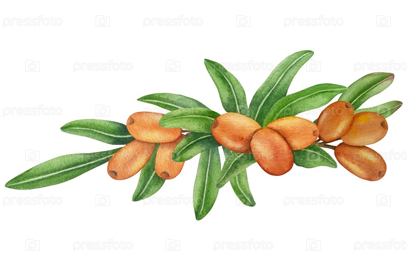 Иллюстрация акварельной краской ветви морского терна с зрелыми ягодами и зелеными листьями на белом фоне, иллюстрация акварели Clipart для упаковки продуктов питания и дизайна
