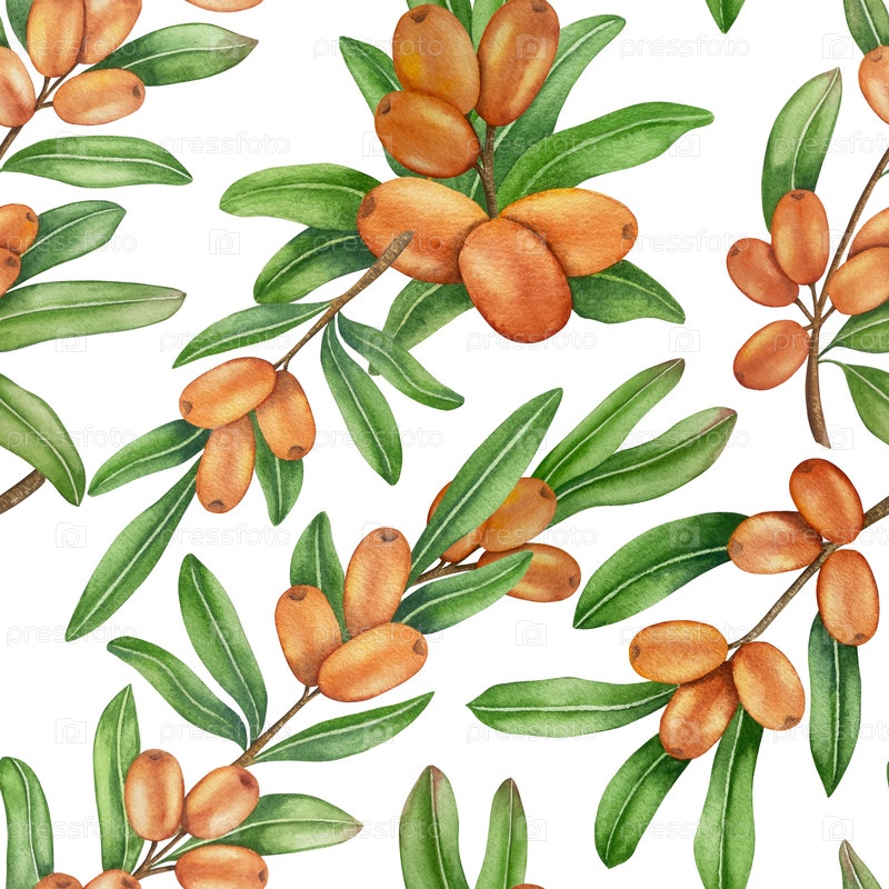 Иллюстрация акварельной краской ветви морского терна с зрелыми ягодами и зелеными листьями на белом фоне, иллюстрация акварели Clipart для упаковки продуктов питания и дизайна