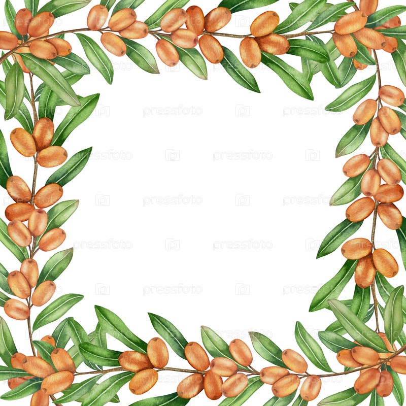 Иллюстрация акварельной краской ветви морского терна с зрелыми ягодами и зелеными листьями на белом фоне, иллюстрация акварели Clipart для упаковки продуктов питания и дизайна