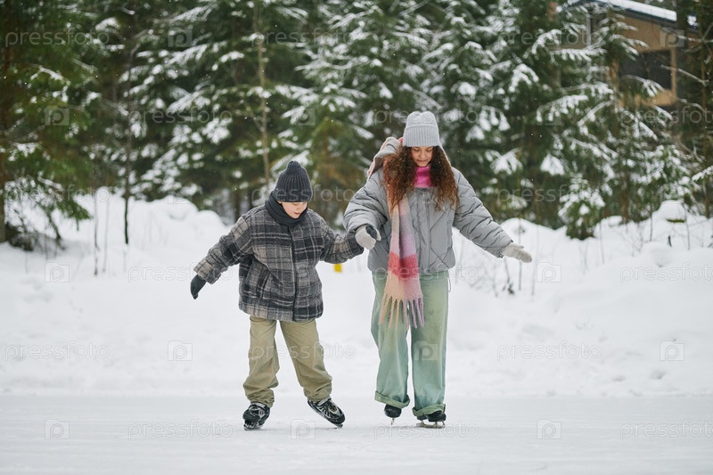 Женщина помогает молодому мальчику кататься на коньках в открытом воздухе зимой