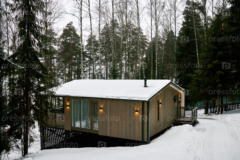 Современный деревянный домик, расположенный среди заснеженных сосен в зимнем лесу