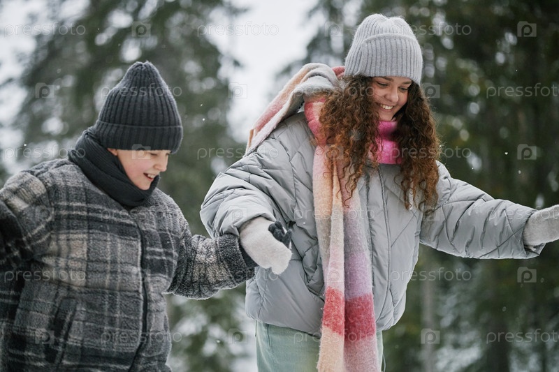 Мама и мальчик-подросток вместе гуляют на улице зимой