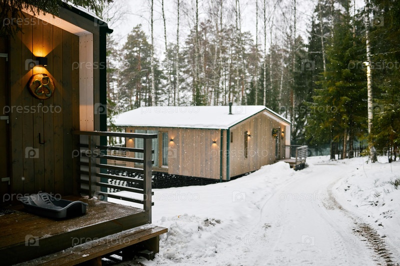 Зимние лесные хижины в окружении снега и сосновых деревьев днем