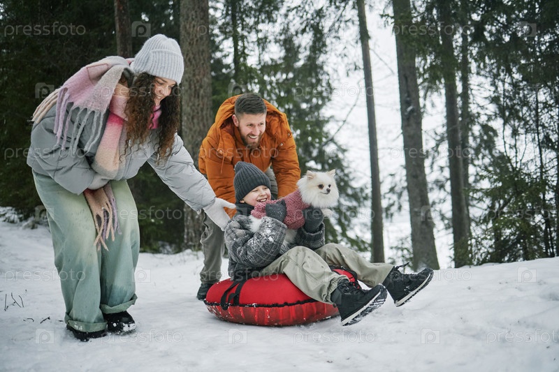 Семья наслаждается зимними активными действиями на открытом воздухе с детским катанием на санках в снегу