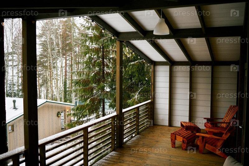 Пустые деревянные стулья с видом на заснеженный лес со крыльца хижины
