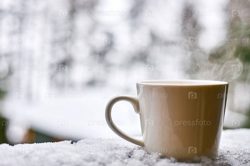Горячие напитки, испаряющиеся на снежной поверхности во время зимнего утра
