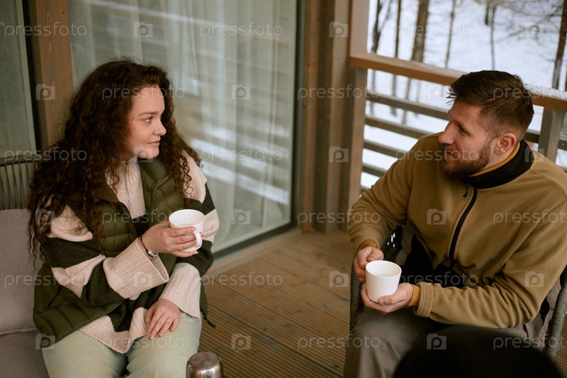 Молодая женщина и мужчина пьют горячие напитки на открытом воздухе