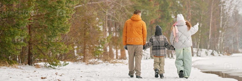 Семья гуляет вместе в зимнем лесу, держась за руки и наслаждаясь природой