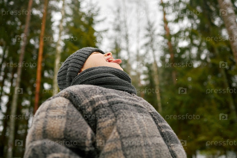 Ребенок ловит снежинки языком в зимнем лесу на открытом воздухе