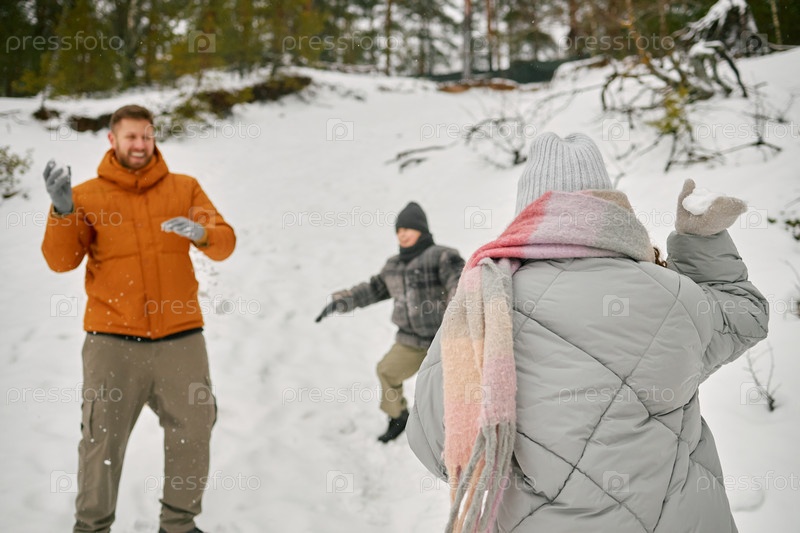 Человек и ребенок играют вместе на открытом воздухе во время зимней битвы со снежным мячом