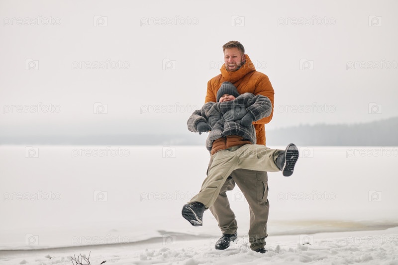 Человек, вращающий счастливого ребенка на открытом воздухе в зимний день