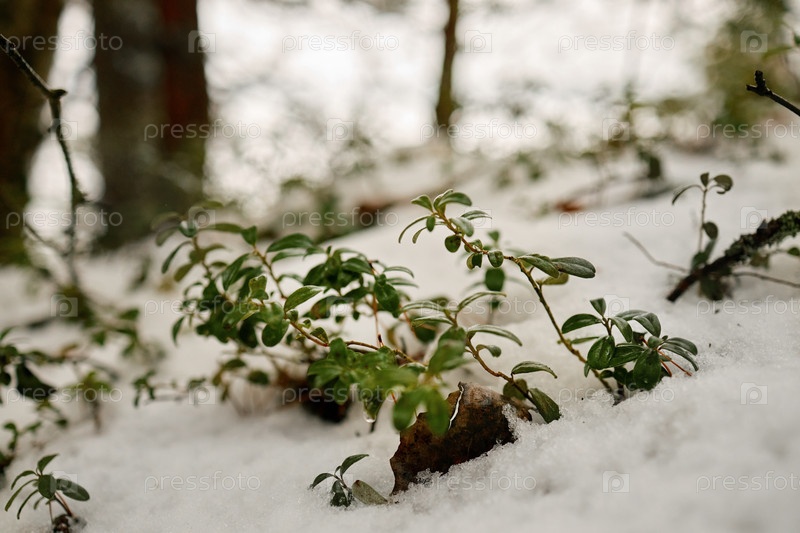 Зелёные растения, появляющиеся через снег в лесу во время раннего весеннего таяния