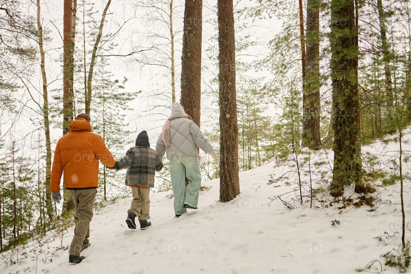 Семейная прогулка вместе через снежный зимний лес в дневное время