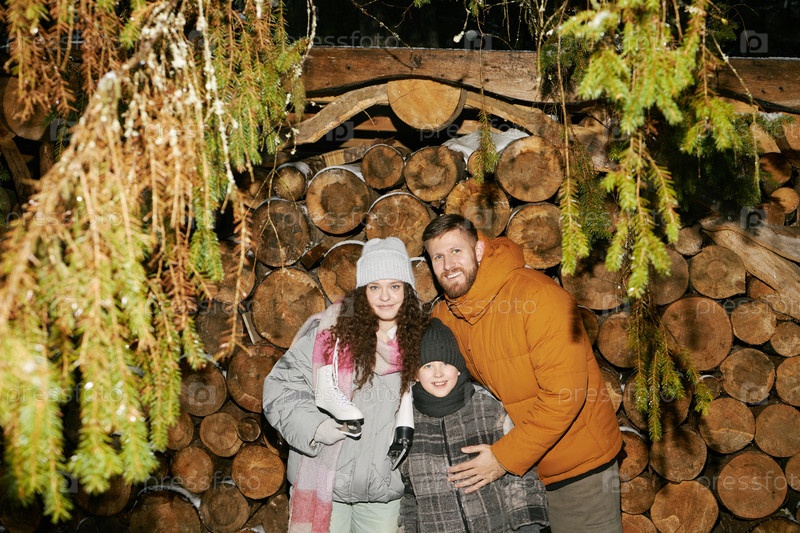 Отец обнимает улыбающуюся жену и сына, позирующих на улице зимой