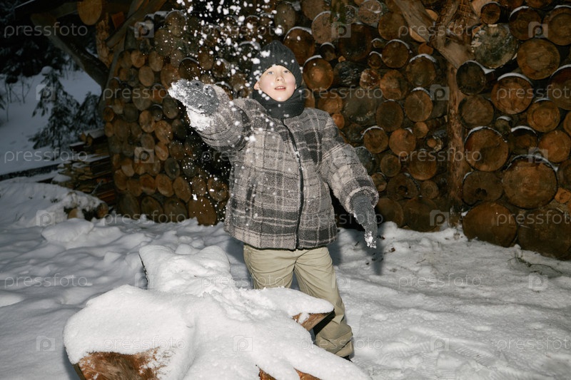 Играя со снегом на открытом воздухе в зимний период возле мальчика с заложенным дровами