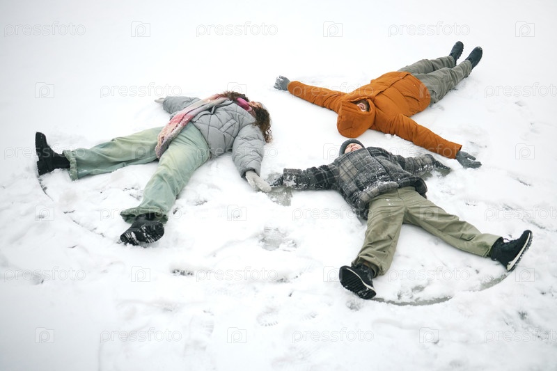 Семья делает снежных ангелов на открытом воздухе в зимний день