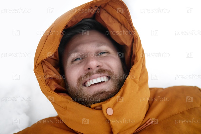 Портрет молодого взрослого мужчины, улыбающегося, лежа на снегу в открытом воздухе