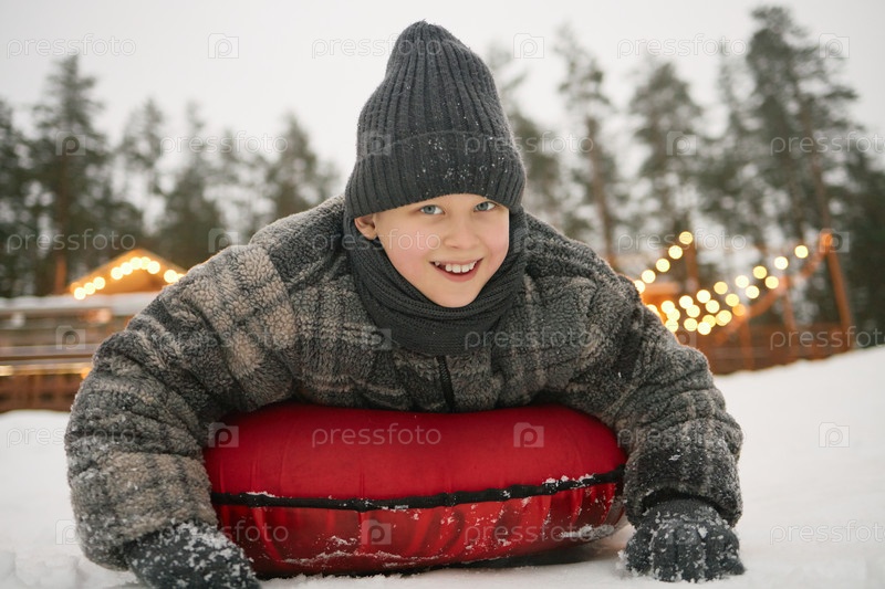 Портрет мальчика, спускающегося по снежному холму на надувной трубе в открытом воздухе