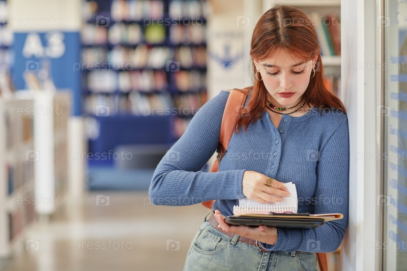 Девушка-подросток пишет записи в блокноте, стоя в библиотеке