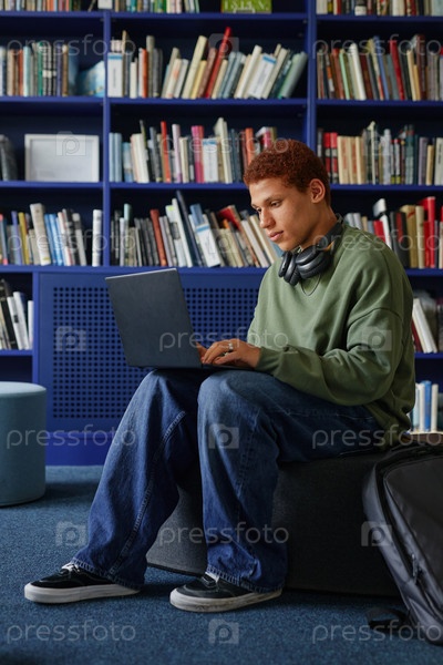 Тинейджерский бирациальный мальчик использует ноутбук-компьютер во время учебы в библиотеке
