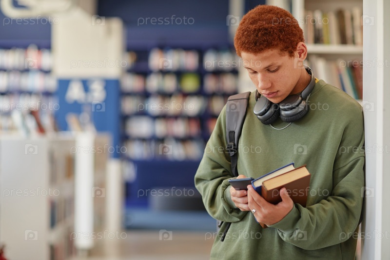 Подросток-бирациальный мальчик использует смартфон, держа книги в библиотеке