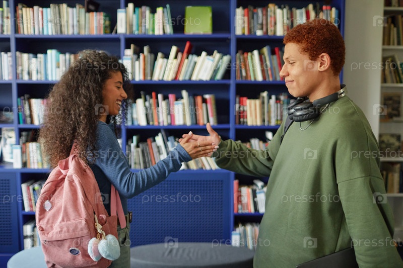 Подростки BiracialДрузья приветствуют друг друга рукопожатием в библиотеке