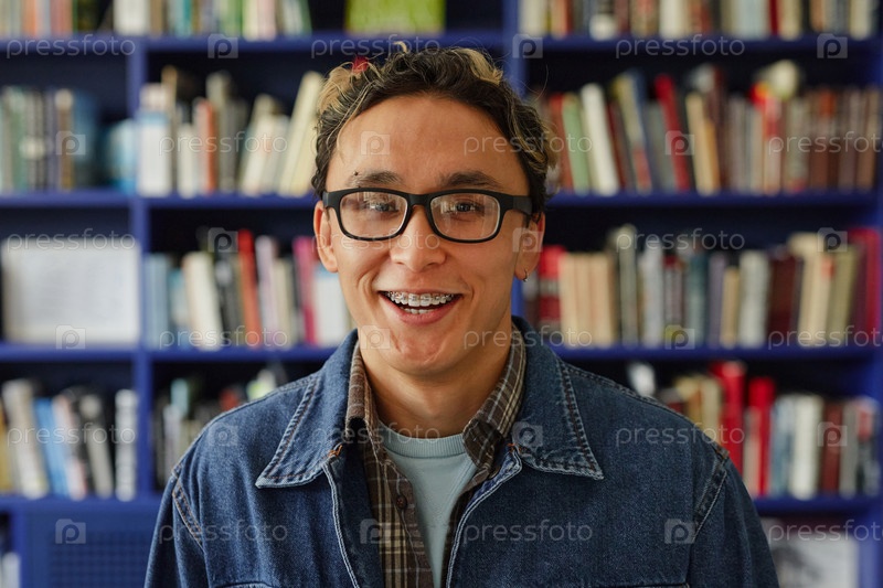 Портрет молодого взрослого мужчины, улыбающегося, стоящего в библиотеке