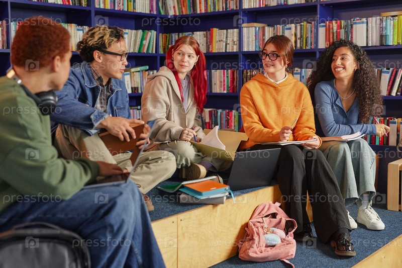 Группа мультиэтнических подростков, изучающих вместе в современной библиотеке