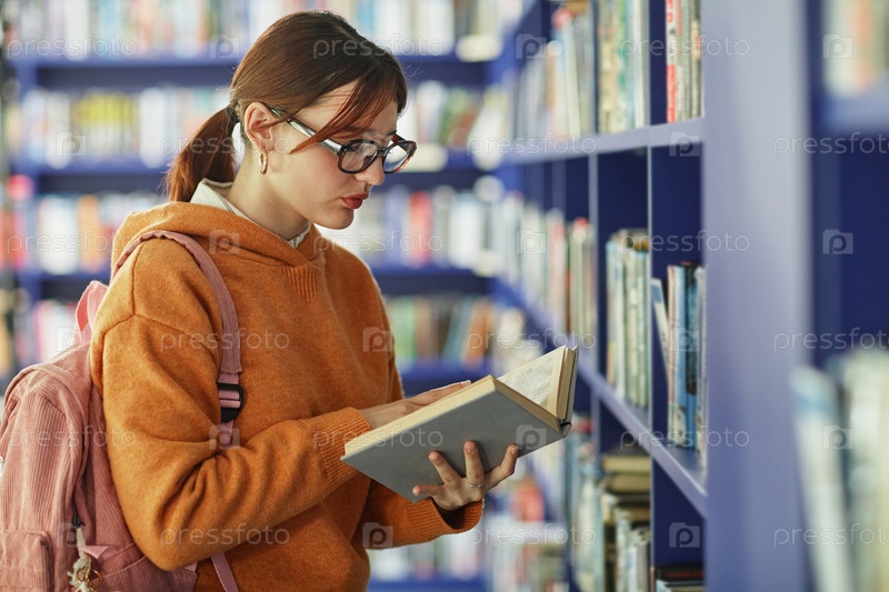 Молодая женщина читает книгу, стоя на книжных полках библиотеки