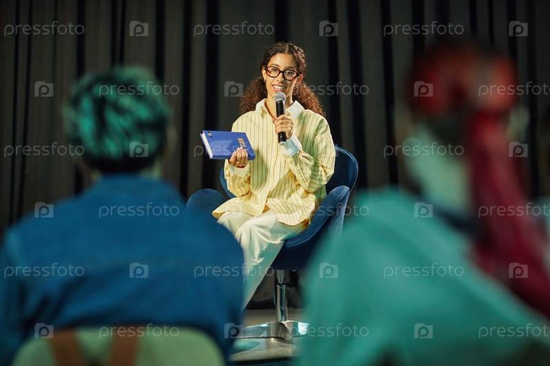 Молодая взрослая женщина, говорящая в микрофон во время панельной дискуссии