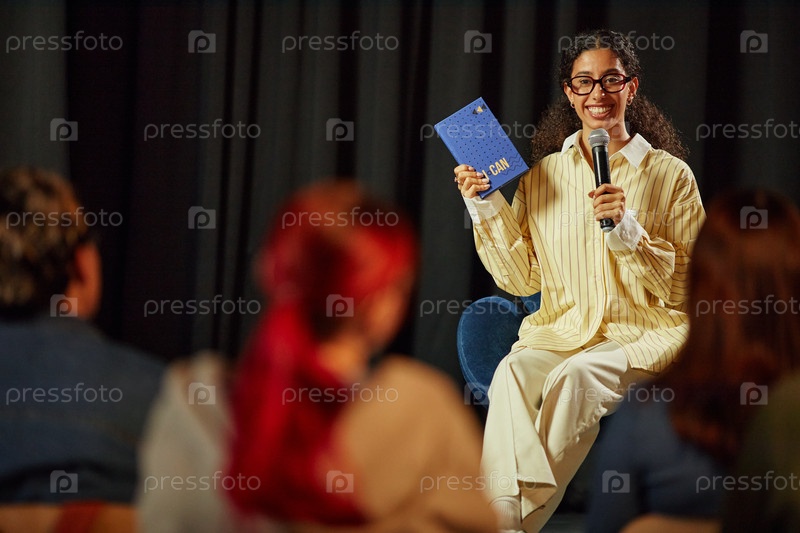 Молодая взрослая женщина, представляющая книгу аудитории во время публичного мероприятия