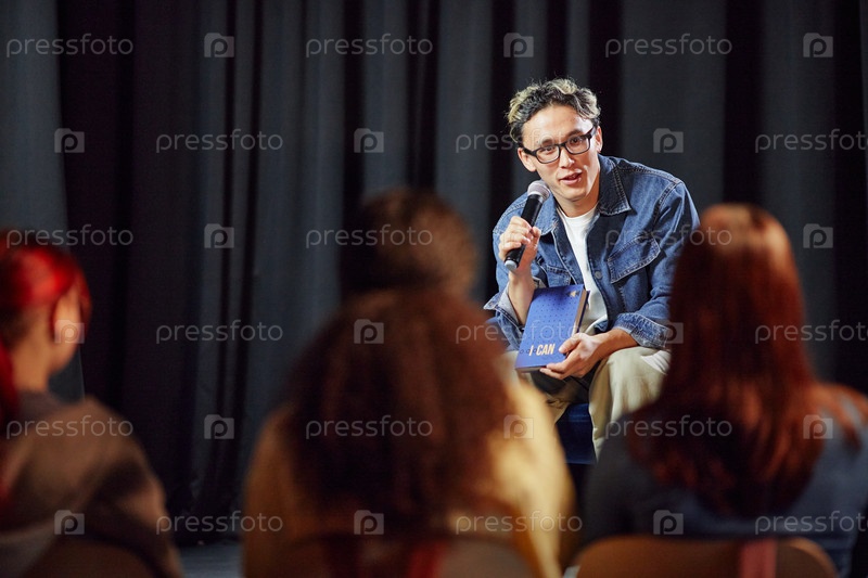 Молодой взрослый мужчина говорит в микрофон, обращаясь к разнообразной аудитории