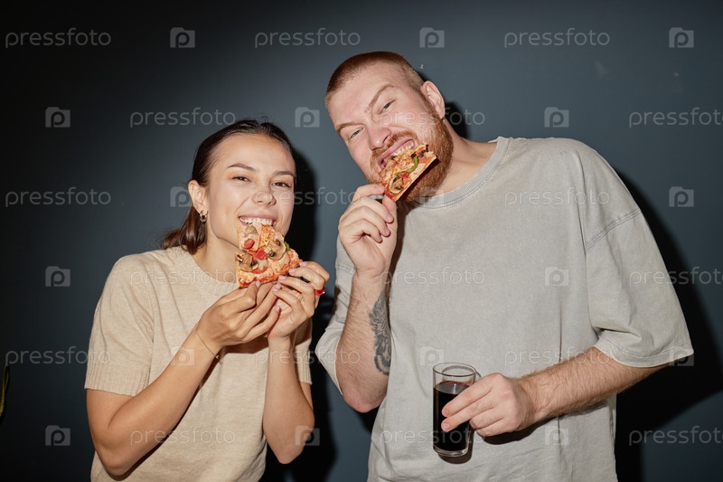 Портрет молодой женщины и молодого человека, которые вместе едят пиццу