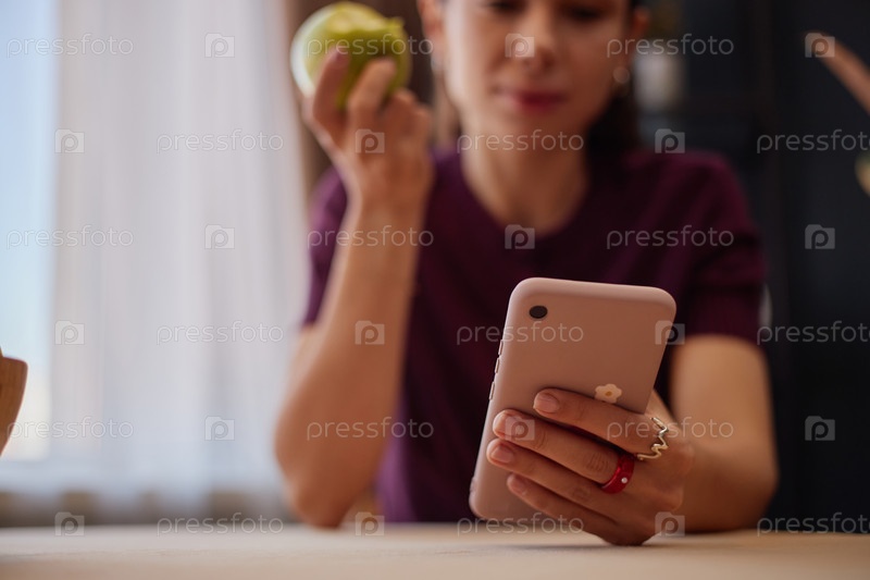 Молодая взрослая женщина использует смартфон, держа зеленое яблоко в помещении