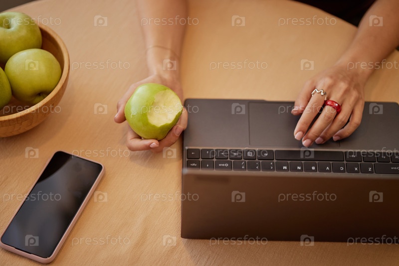 Молодая взрослая женщина работает на ноутбуке, едя зеленое яблоко