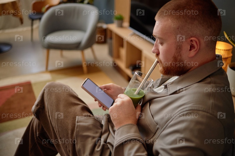 Молодой взрослый мужчина сидит в помещении, используя смартфон и пьет смузи