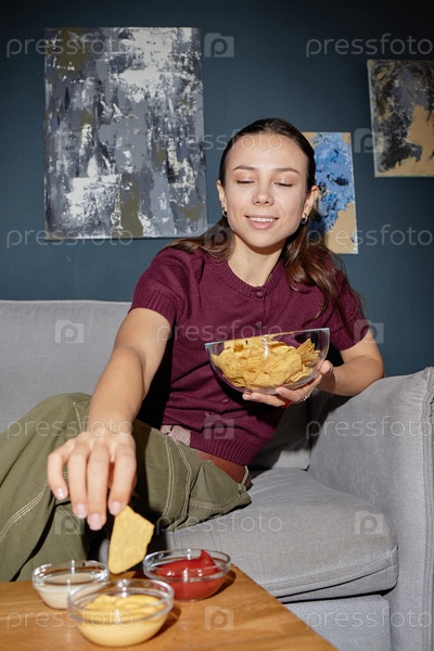 Молодая женщина ест начо и погружает чипсы в соус, улыбаясь